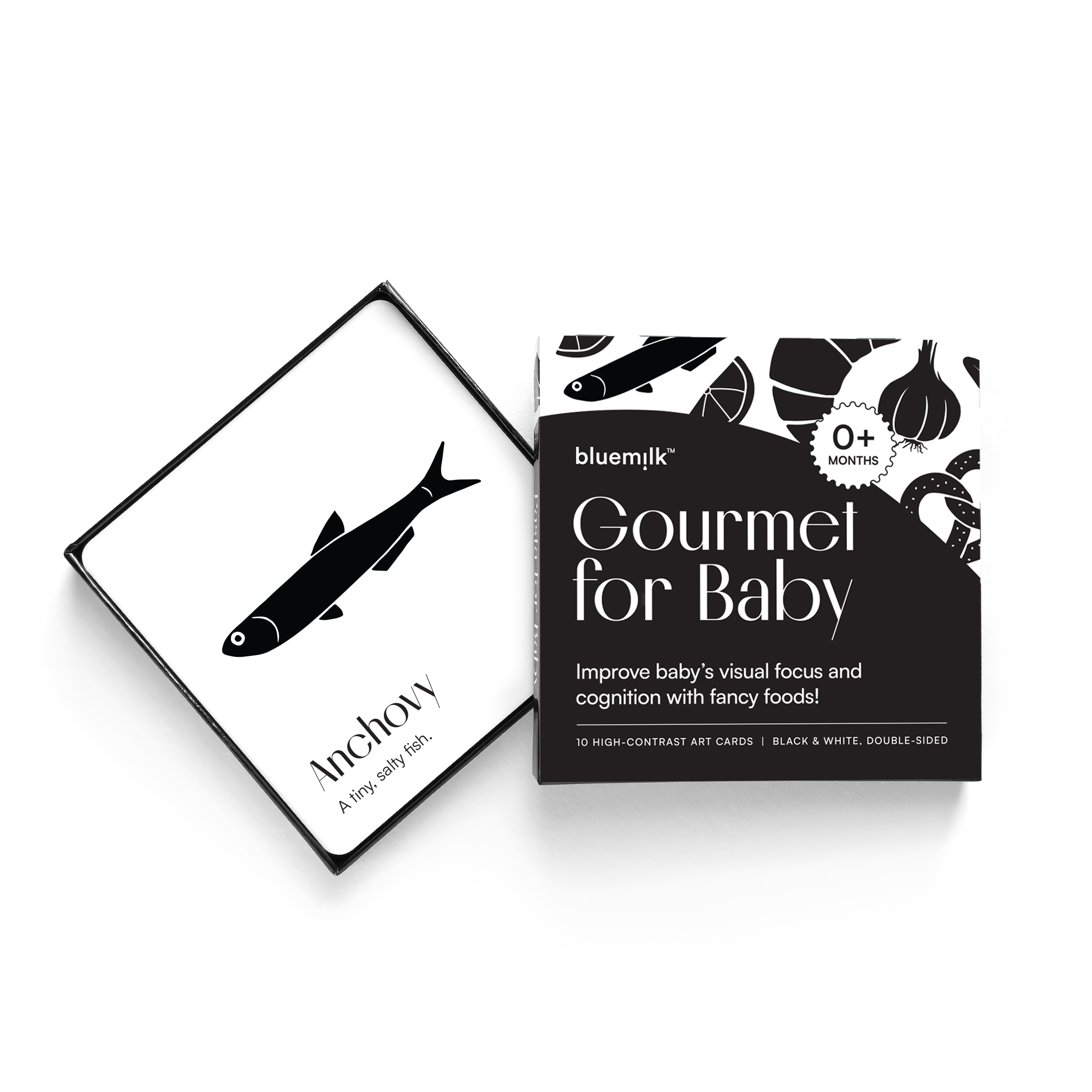 BlueMilk Gourmet for Baby High Contrast Sensory Learning Toy 10 Large Black & White Flash Cards of Food Shapes. Tummy Time Game Curious Baby Toys Activity Infant & Newborn Baby Essentials 0+ Months