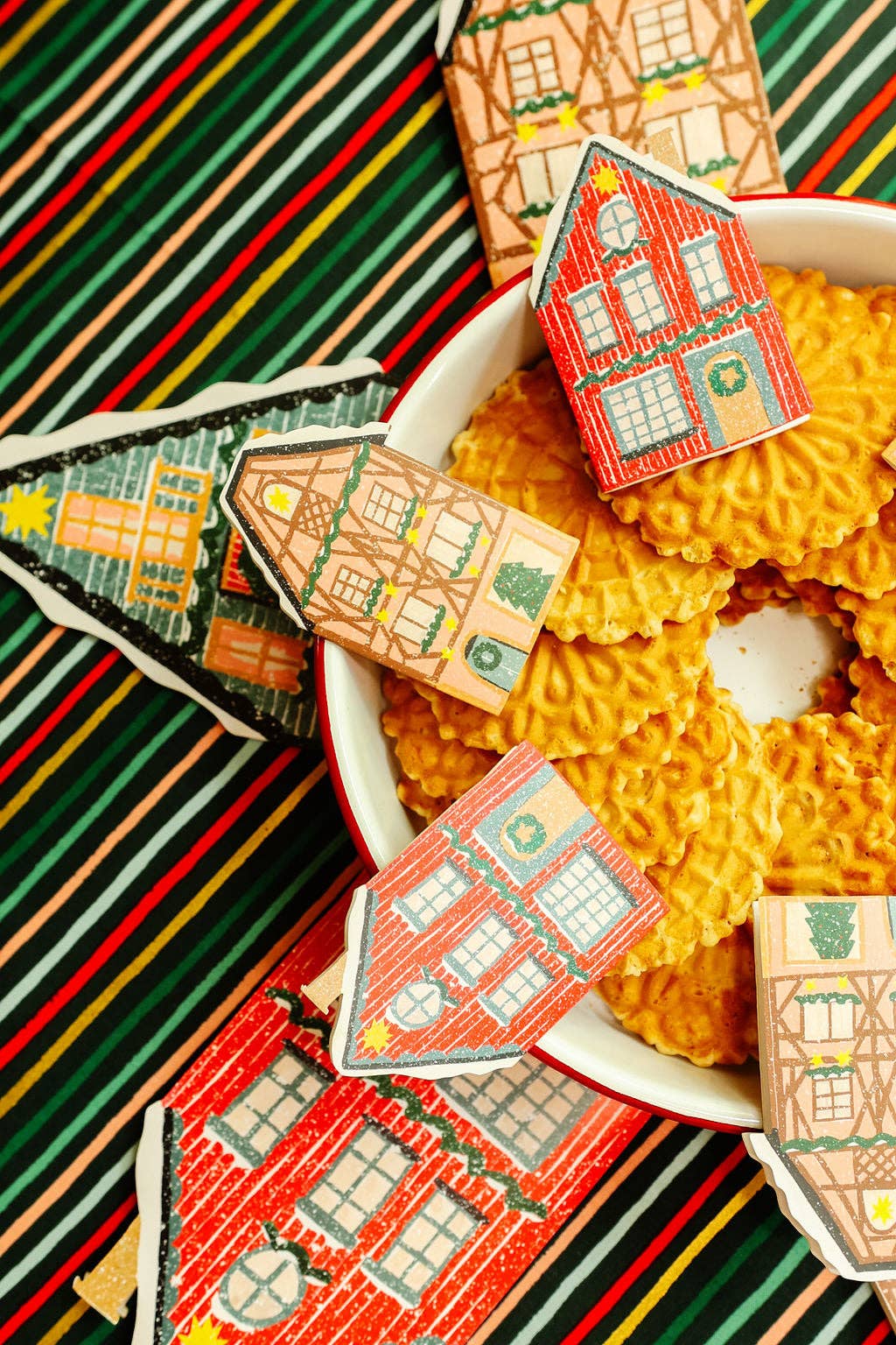 A snowy triangular blue cottage, calm and twinkling with holiday magic. Part of our Winter Cottage Collection, inspired by nostalgic village scenes and Nordic charm.