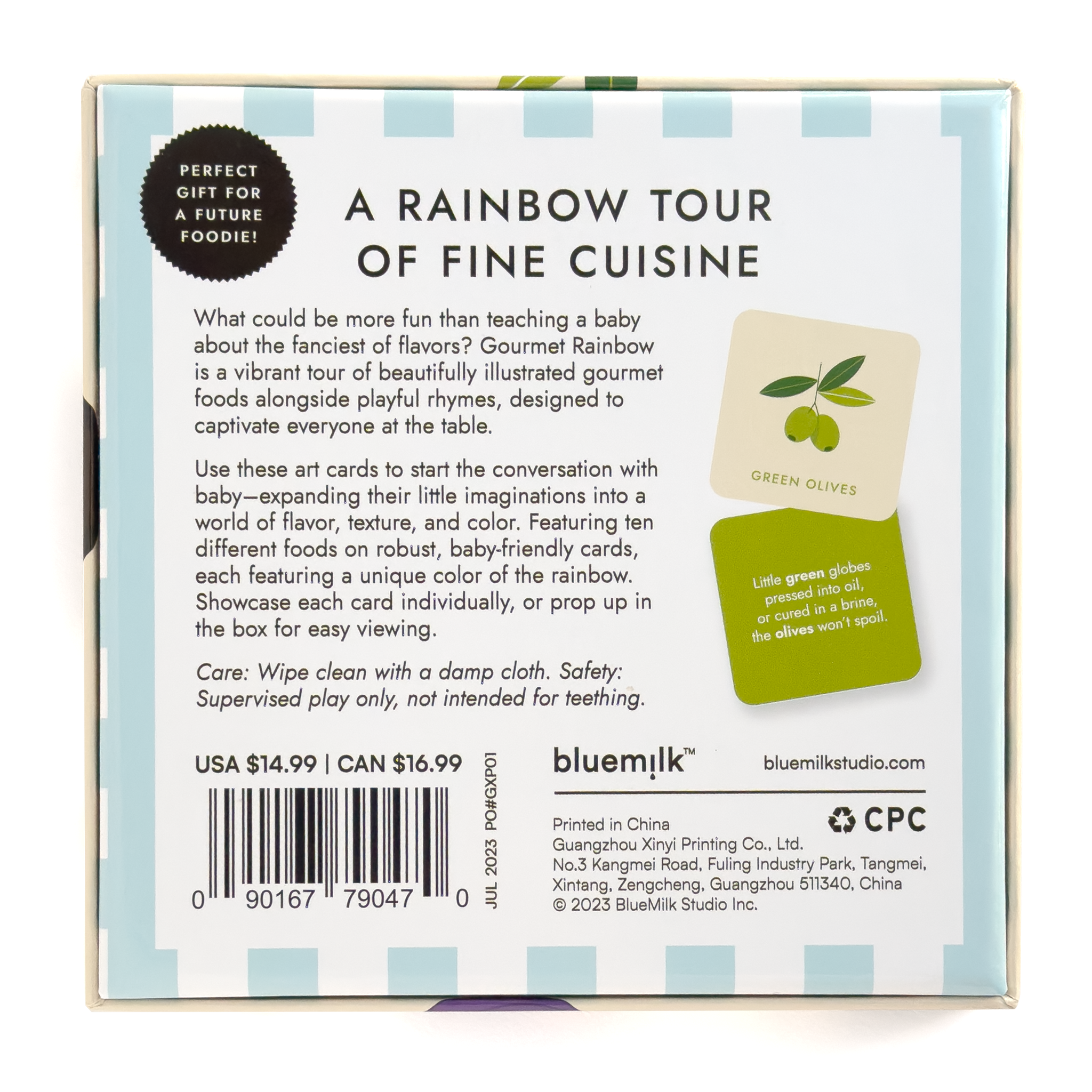 Gourmet Rainbow color art cards feature charming, playful silhouettes of fancy foods and creative poems featuring the food and color will captivate even the youngest soon-to-be chefs and are a fun and exciting way to play with infants and babies.