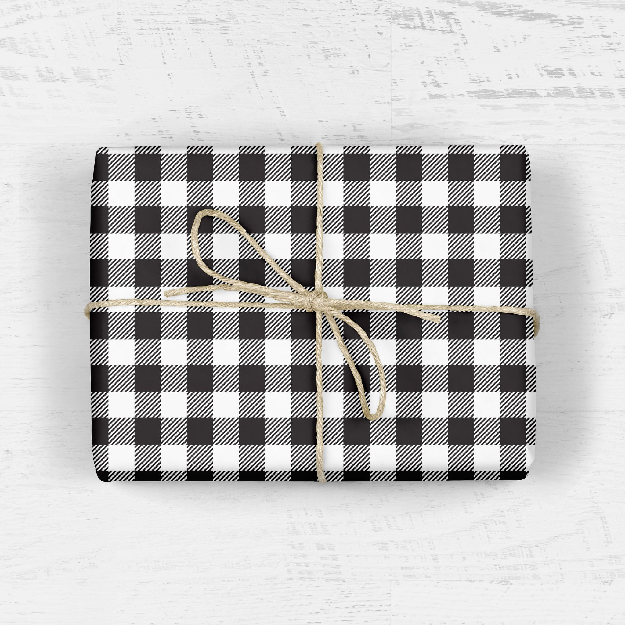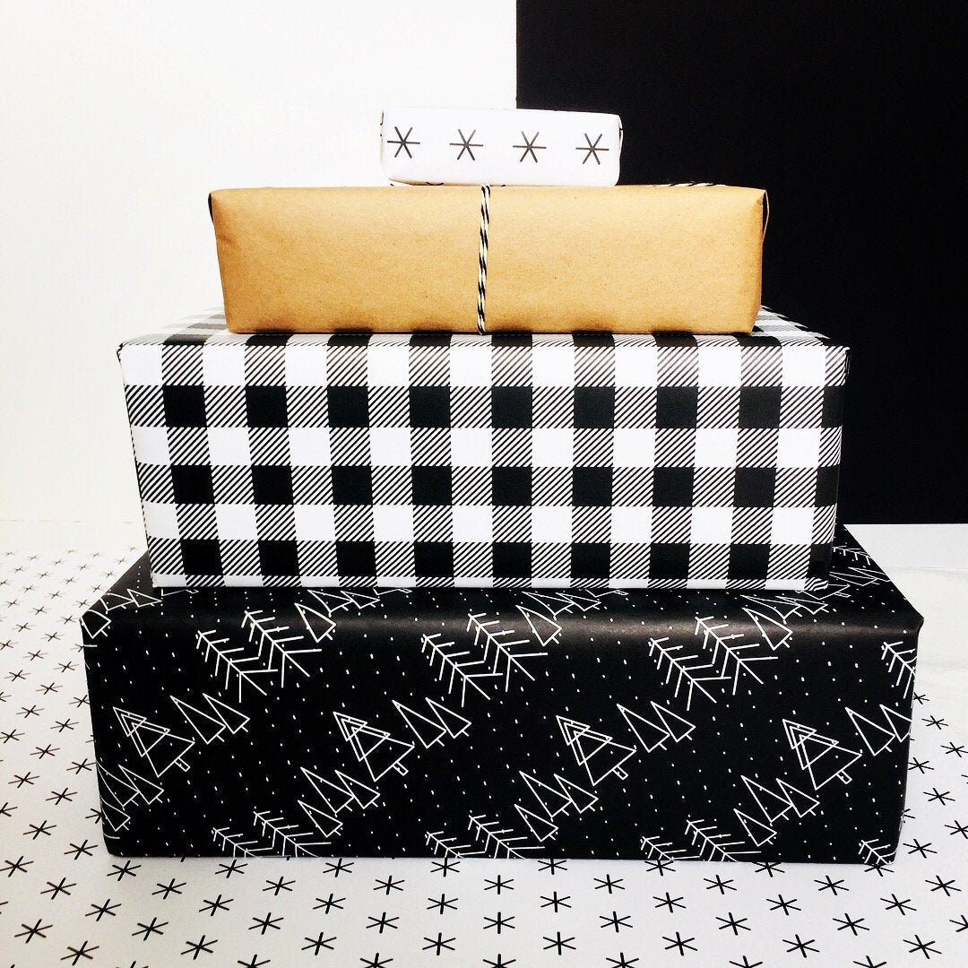 Classic buffalo plaid wrapping paper in Black and white is sure to steal the show this holiday season. Get creative and add a colorful ribbon, pom-poms, washi tape or keep it neutral with an elegant jute string!
